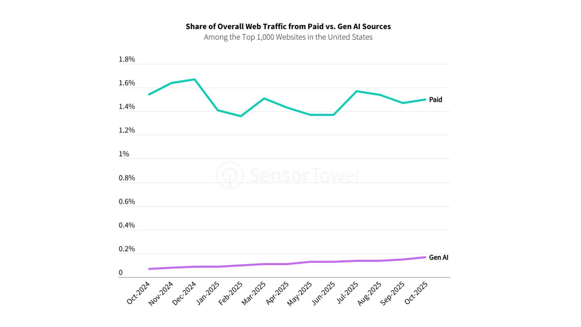 Хотя ИИ пока остается относительно небольшим источником трафика, его доля быстро растет. В результате к октябрю 2025 года более 37% топ-сайтов США получали больше трафика из Gen AI, чем из платной рекламы.