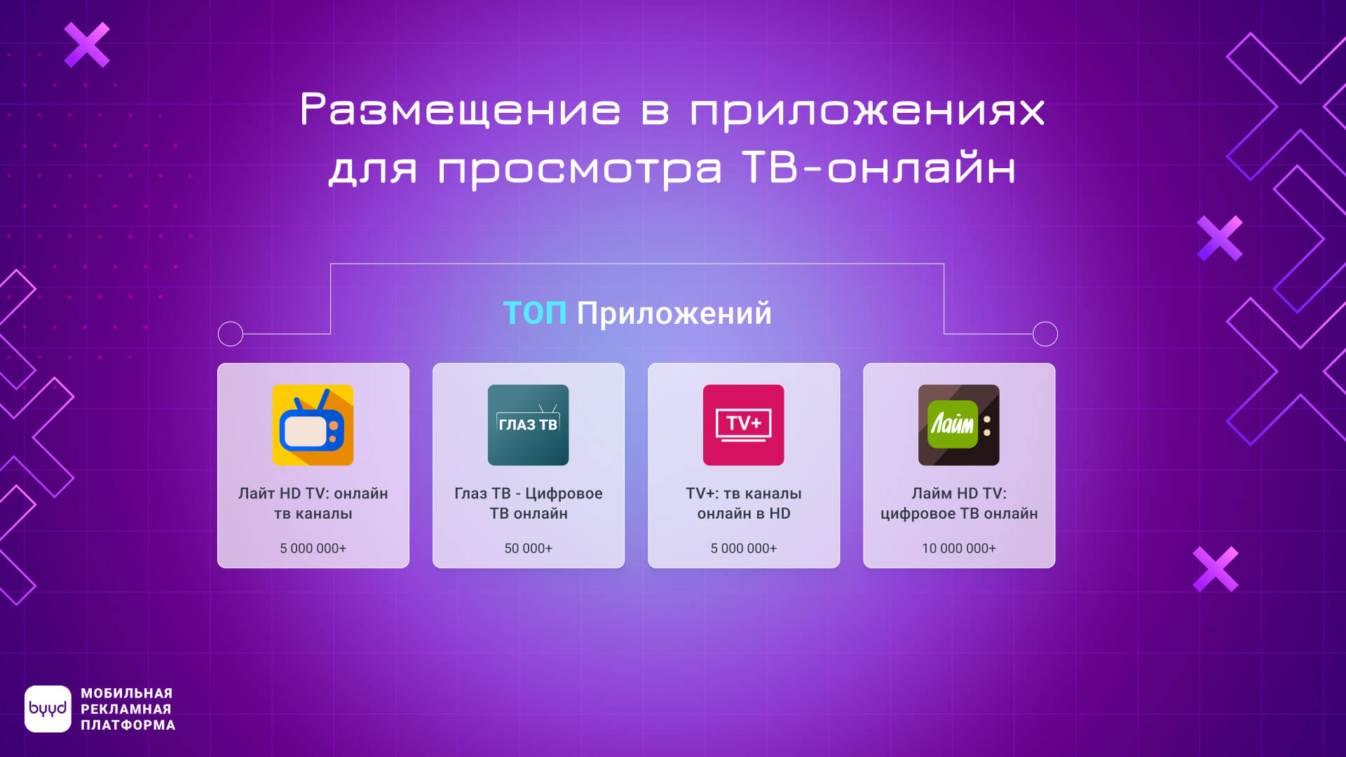 Платформа BYYD выстраивает размещение с учетом особенностей бренда и его задач. В зависимости от целевой аудитории подбираются релевантные категории приложений. В их число входят как игровые (стратегии, головоломки, шутеры), так и неигровые (сервисы, утилиты).
