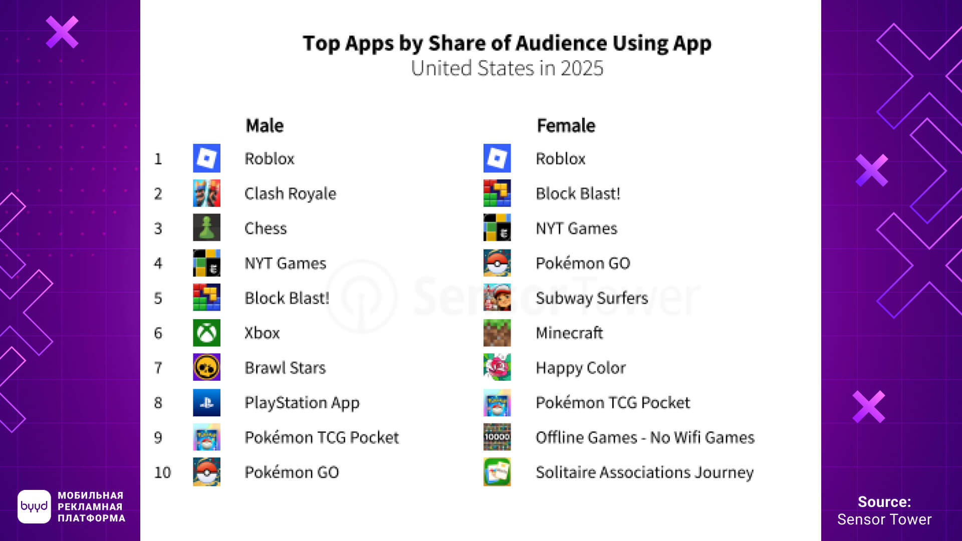 К примеру, Clash Royale и Chess.com входят в топ-5 приложений среди мужчин, но не попадают в топ-10 у женщин. В то же время Subway Surfers занимает место в топ-5 среди женской аудитории.