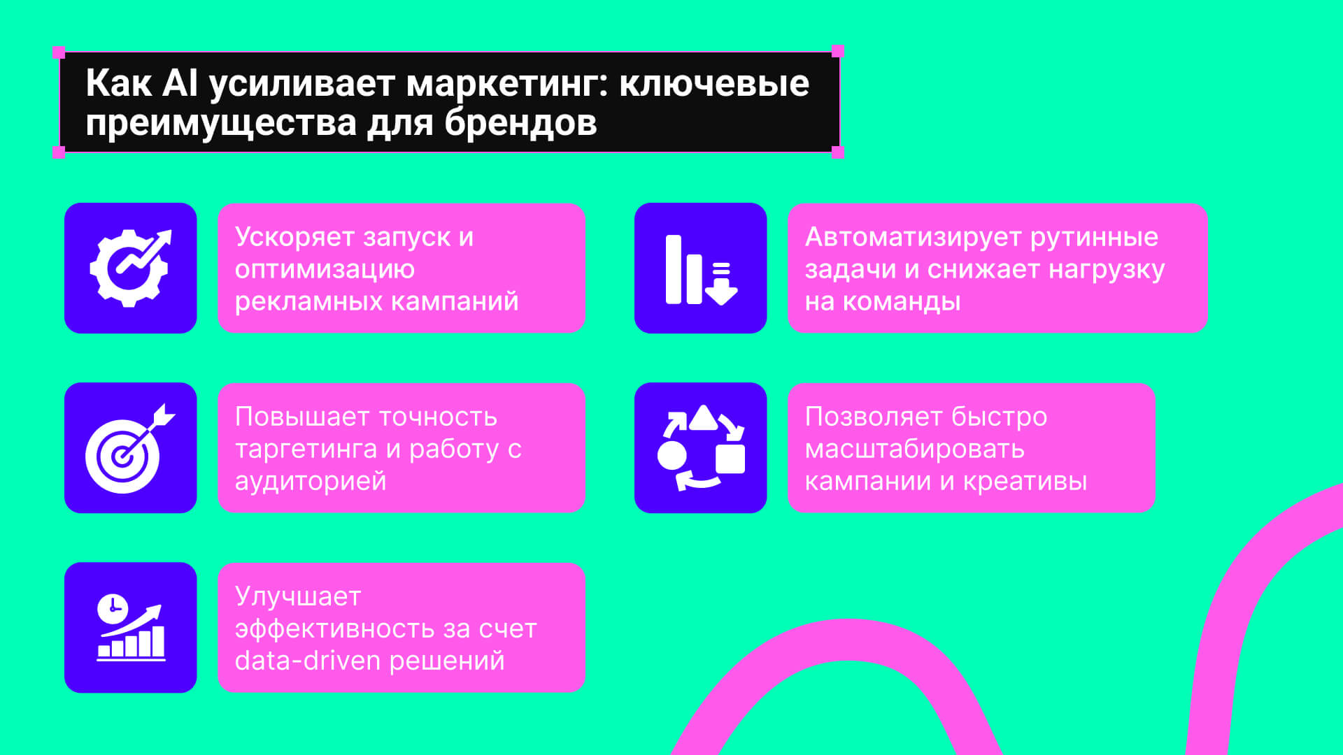 ИИ используется для таргетинга, распределения бюджета, создания креативов и аналитики. Ускоряет запуск и оптимизацию кампаний.